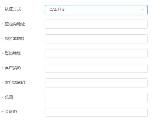 若选择了OAUTH2方式,则需要企业提供重定向地址,服务器地址,登出地址,客户端ID,客户端密钥,同步范围及关联ID