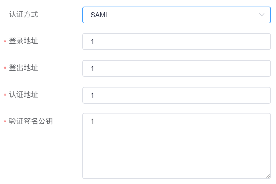 若选择SAML方式,需要企业提供登录地址,登出地址,认证地址和验证签名公钥。