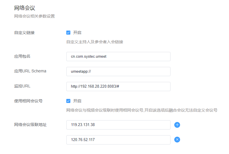 此配置适用于企业需要跳转到网络会议后台监控界面时指定网络会议后台监控界面的地址。配置后可在【运营】-【会议监控】界面的监控操作验证是否跳转成功。URL需要根据企业部署的情况更改地址。