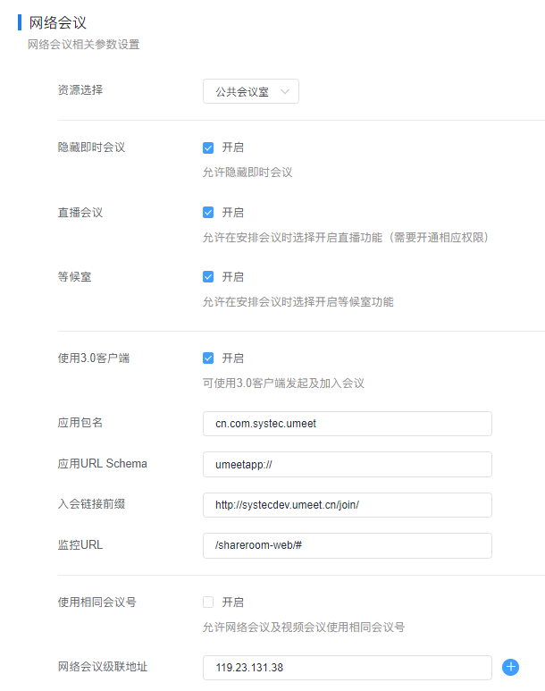 - 若企业购买了网络会议的许可,则需要配置网络会议公共会议室的资源配置