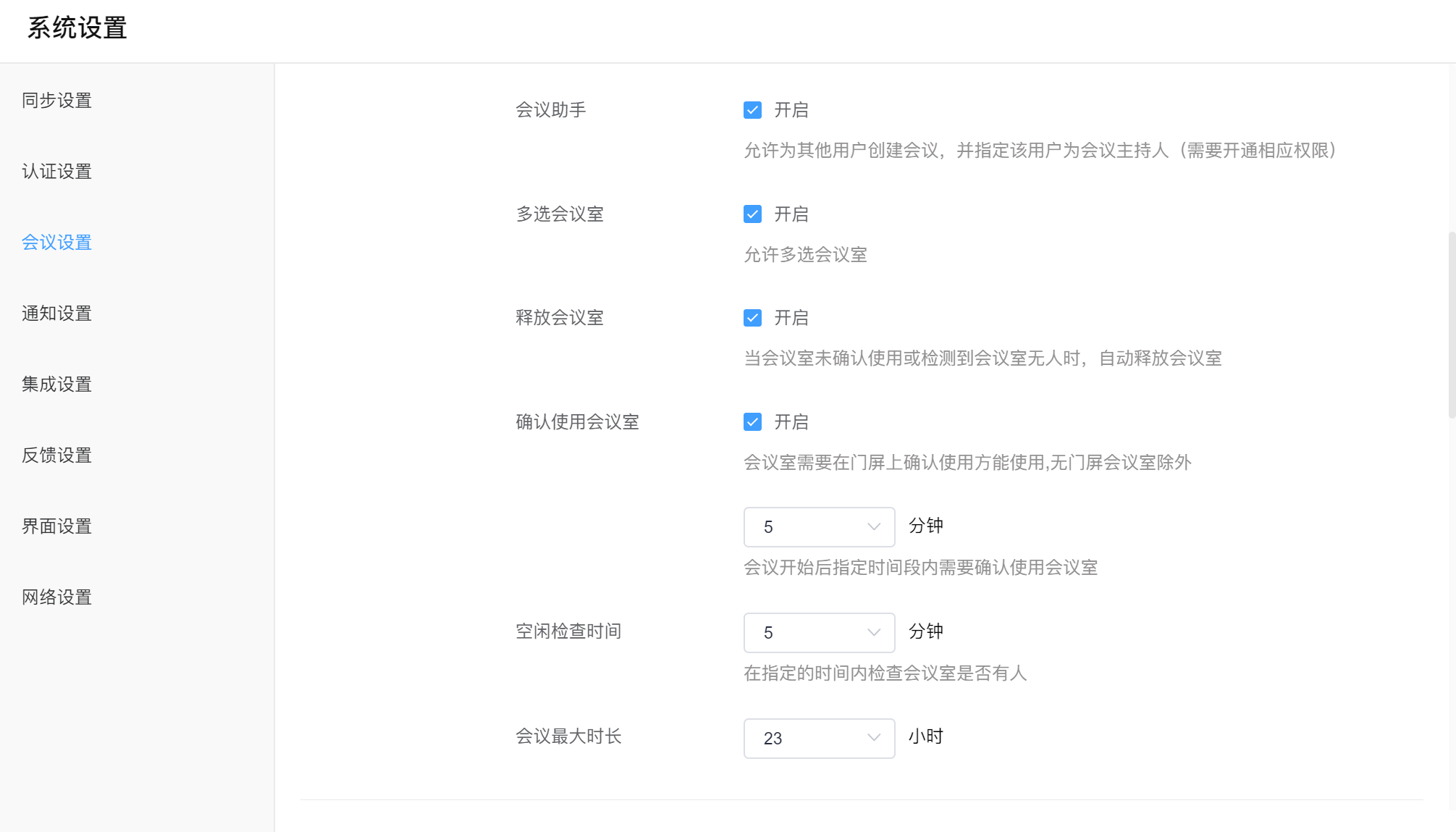 此功能适用于企业会议室有安装热感并需要通过热感检测无人时自动释放会议室。开启功能后可以配置两种参数,一种是【确认使用会议室】,一种是【空闲检查时间】:确认使用会议室仅针对有配套门屏的会议室,勾选后可以通过在门屏上点击【确认使用】结束系统对本次会议的检测,避免系统自动释放掉会议室;而空闲检查时间即针对系统检测无人的时长,当超过配置的时长时系统则自动释放掉会议室。释放时会有通知提醒主持人,该提醒也可以在通知设置中禁用。