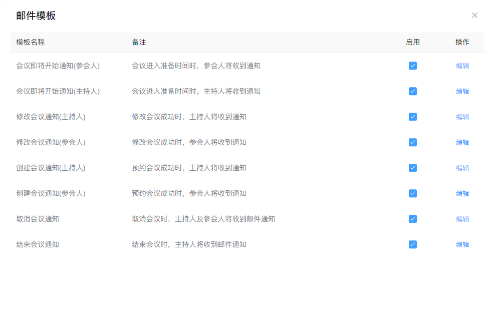 目前支持启用的模板有"创建会议","更新会议","取消会议","结束会议","会议即将开始";