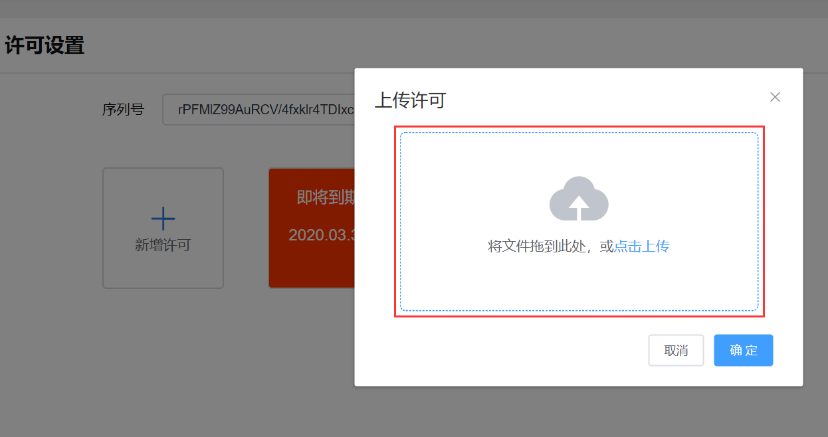 - 点击【新增许可】 后弹出上传界面,点击上传界面即可选择许可文件