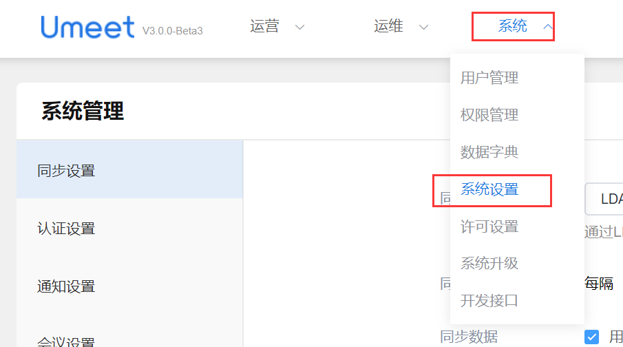 - 点击【系统】-【系统设置】后进入同步设置界面;
