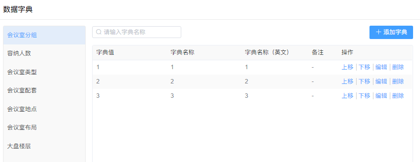 通过【系统】-【数据字典】进入会议室分组界面