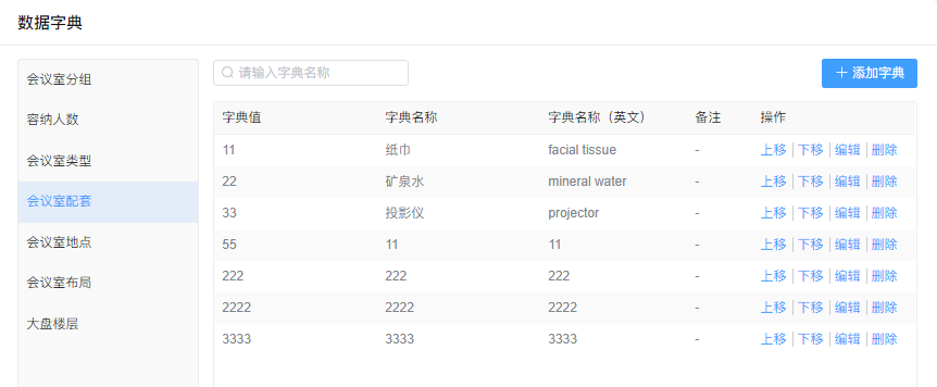 通过【系统】-【数据字典】-【会议室配套】进入界面