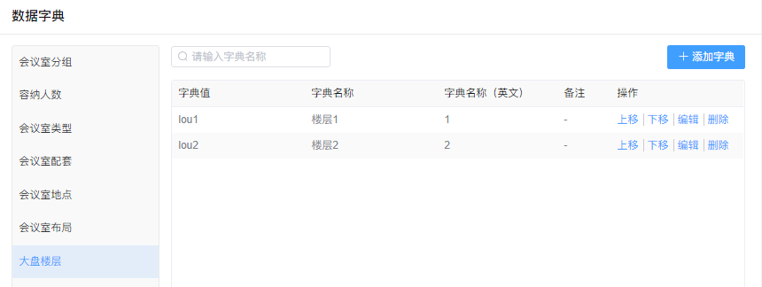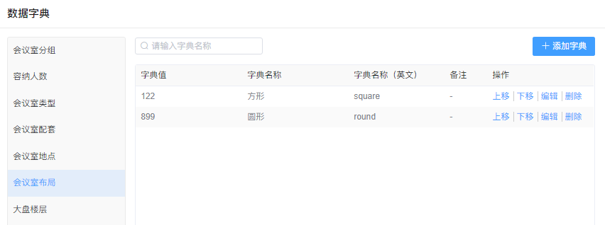 通过【系统】-【数据字典】-【会议室布局】进入界面
