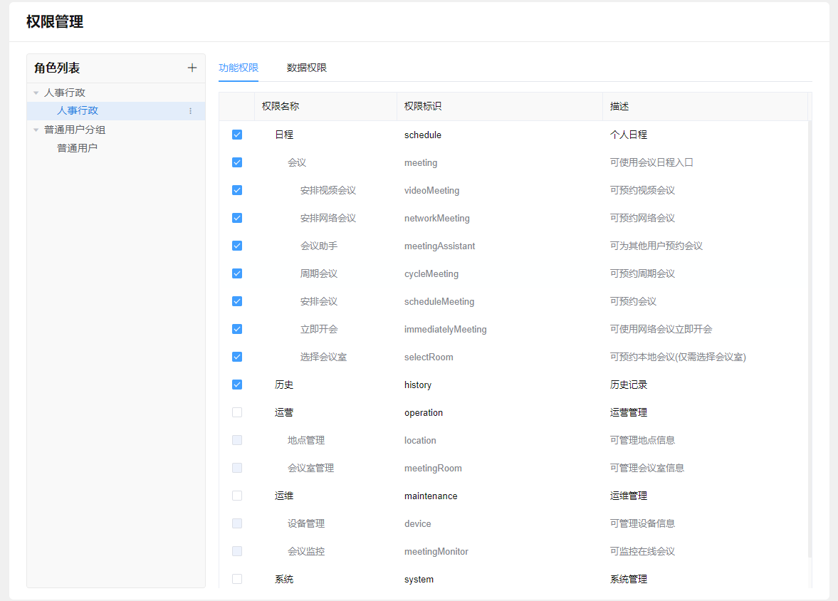 根据企业使用习惯,可为管理员配置会议室的数据权限