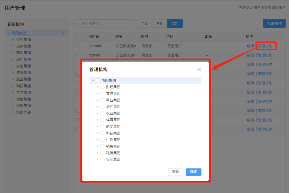 可以在用户管理模块中配置管理机构,相应用户可额外查看/控制所绑定的机构下的会议信息