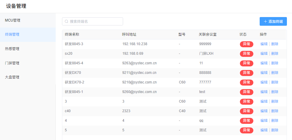 若企业的本地会议室都配套的思科、宝利通或华为等终端,则可以在终端管理添加所有终端;