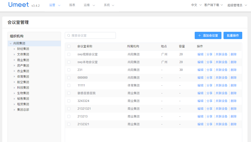 支持添加,编辑和删除会议室,支持批量操作